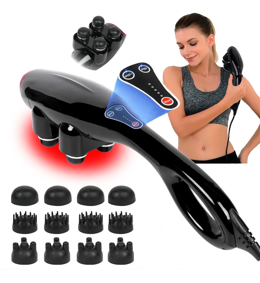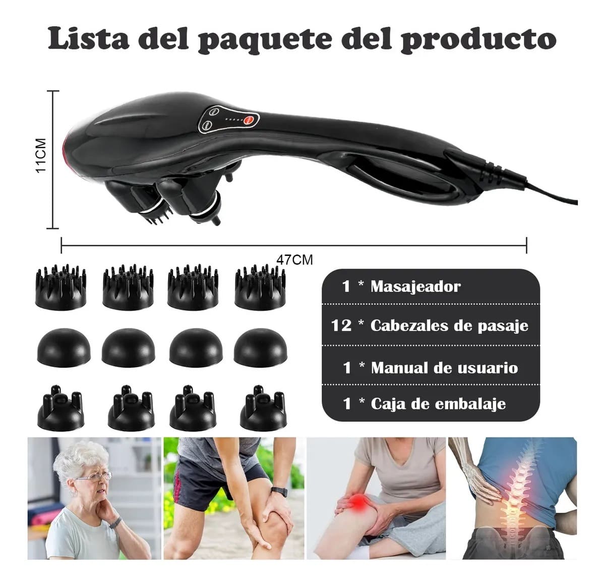 • Contenido del paquete: masajeador eléctrico + 12 cabezales de masaje + manual de usuario.