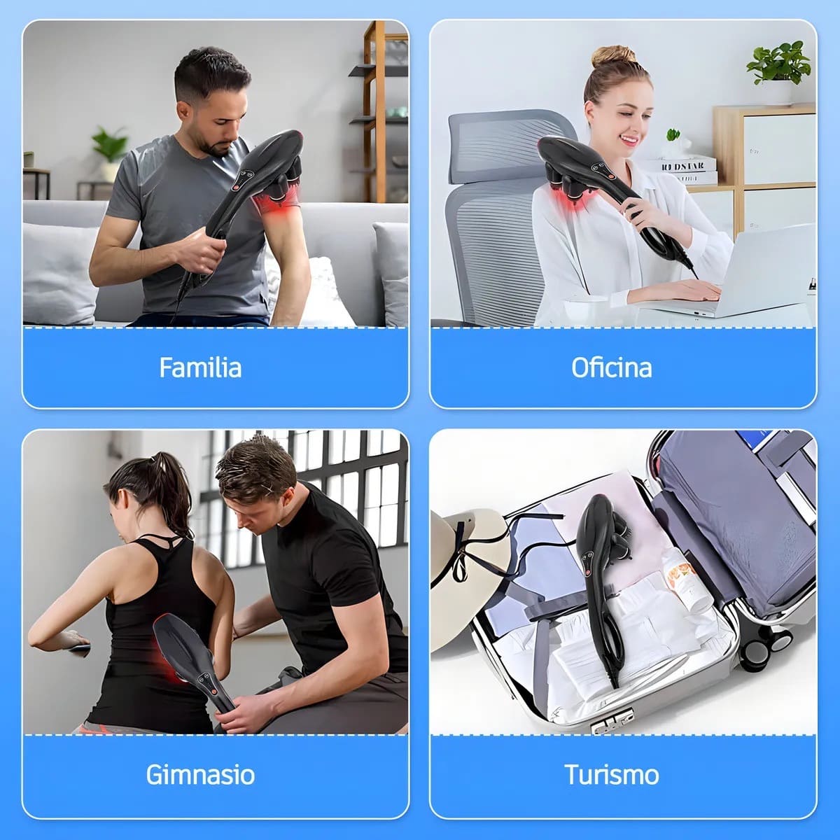 Tecnología de percusión que alivia espalda, cuello, hombros y piernas en minutos. Relájate desde casa y despídete de la tensión.